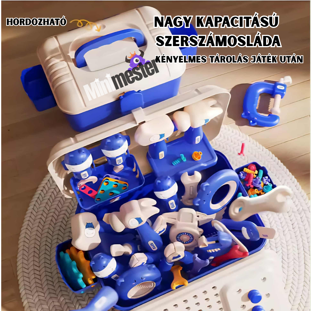 A MiniMester egy többdarabos barkácsjáték, amely játékfúrót, színes csavarokat, anyákat, építőelemeket és praktikus tárolódobozt tartalmaz, így egyszerre kínál rendet, kreativitást és hordozhatóságot. A készlet BPA-mentes, ütésálló ABS műanyagból készült, minden elem lekerekített élű, a gyerekbarát fúró pedig alacsony fordulatszámon működik, így játék közben teljes biztonságban fejleszti a gyerekeket.
