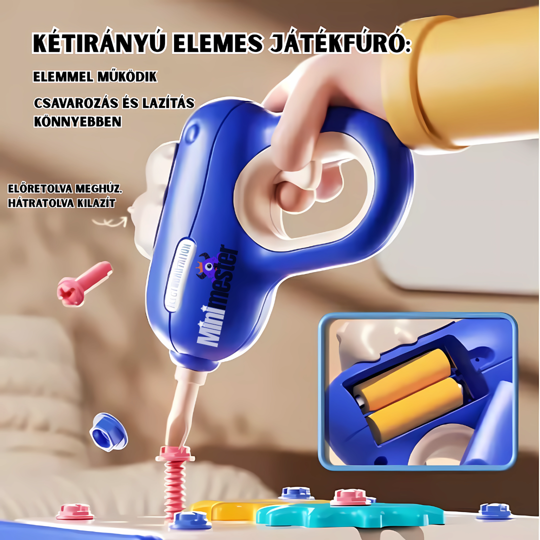 A MiniMester játékfúrót 2 db AA elemmel működtethetjük, bekapcsolása egyetlen gombnyomással történik. A gyerekek biztonságosan csavarozhatnak, építhetnek és alkothatnak, miközben fejlődik a kézügyességük, kreativitásuk és problémamegoldó gondolkodásuk.