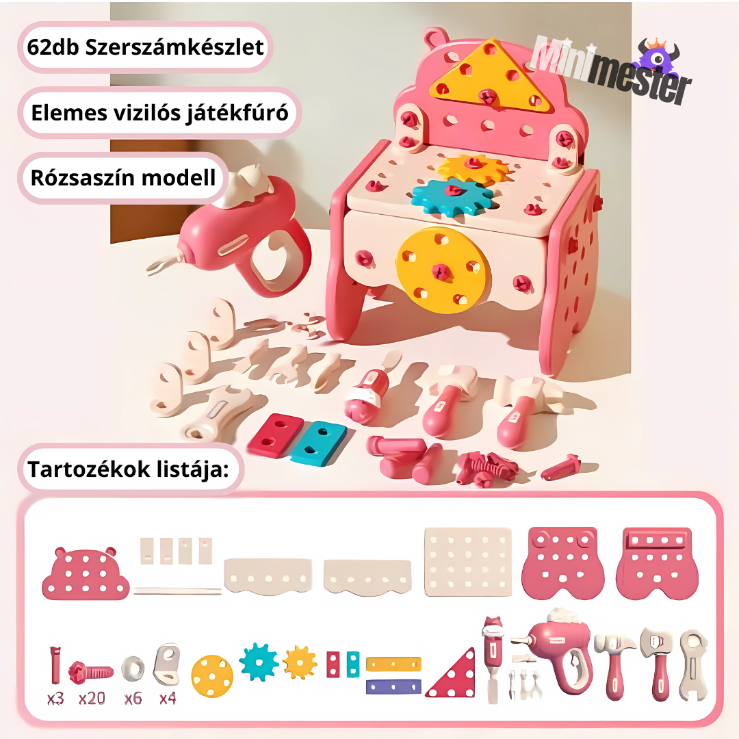 A MiniMester egy többdarabos barkácsjáték, amely játékfúrót, színes csavarokat, anyákat, építőelemeket és praktikus tárolódobozt tartalmaz, így egyszerre kínál rendet, kreativitást és hordozhatóságot. A készlet BPA-mentes, ütésálló ABS műanyagból készült, minden elem lekerekített élű, a gyerekbarát fúró pedig alacsony fordulatszámon működik, így játék közben teljes biztonságban fejleszti a gyerekeket.